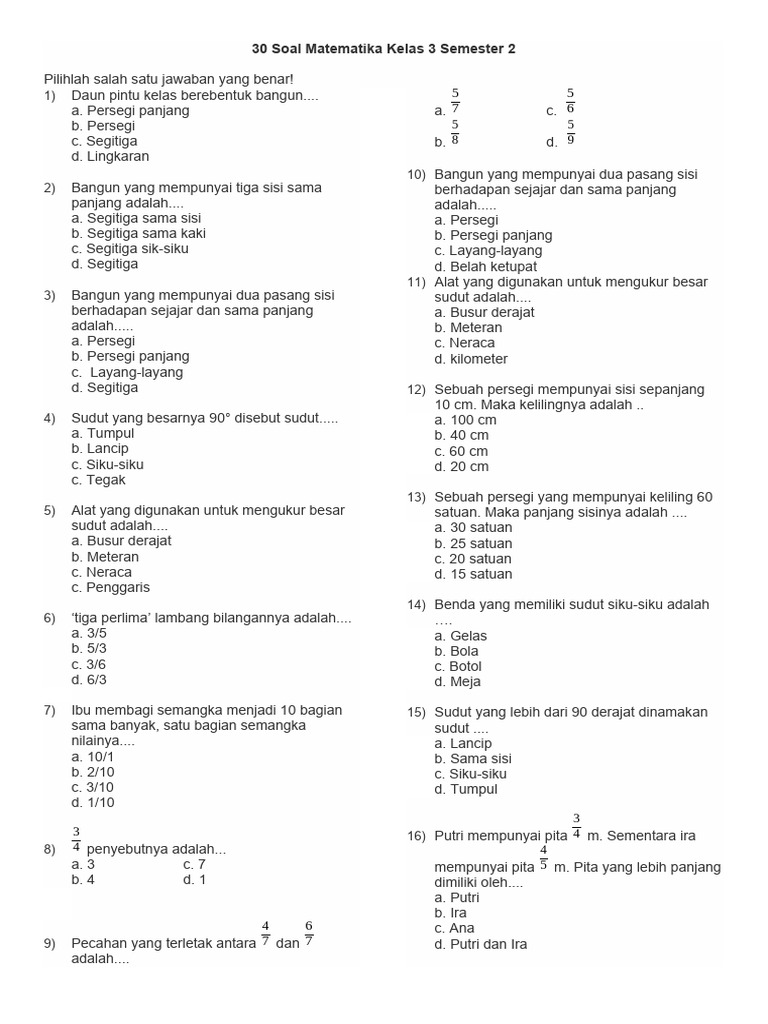 Matematika Kelas IV Semester 2 menawarkan berbagai konsep menarik yang sangat relevan dengan kehidupan sehari-hari. Dengan pemahaman yang baik terhadap materi pecahan, desimal, pengukuran, bangun datar, dan bangun ruang, siswa akan lebih siap menghadapi tantangan matematika di jenjang berikutnya. Semoga contoh soal dan pembahasan yang disajikan dalam artikel ini dapat menjadi bekal berharga bagi setiap siswa untuk meraih kesuksesan dalam belajar matematika. Teruslah berlatih, bertanya, dan jangan pernah menyerah!